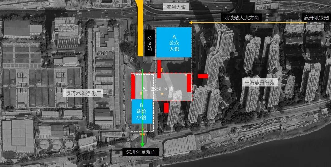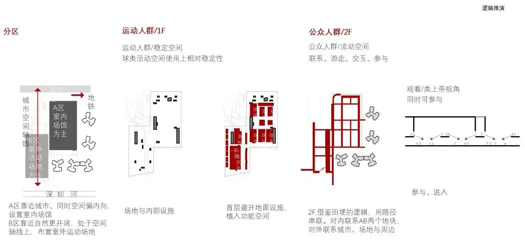 从逻辑排布来看,A地块被住宅、城市所围合,属性上相对内向,适合布置室内场馆;B地块临深圳河、香港景观,适合布置室外活动场地。