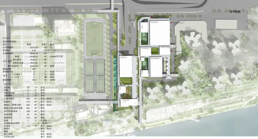 A地块室内场馆围绕中心“森林小庭院”展开,北边主场馆,左侧羽毛球馆,南侧和右侧进阶球馆。左边有两块下沉的院子,布置室外网球设施。B地块有一个抬到二层的篮球馆,首层是车道与地库出入口,靠近水边是开放的公共庭院和飞鸟瑜珈亭。