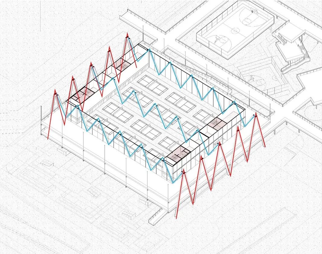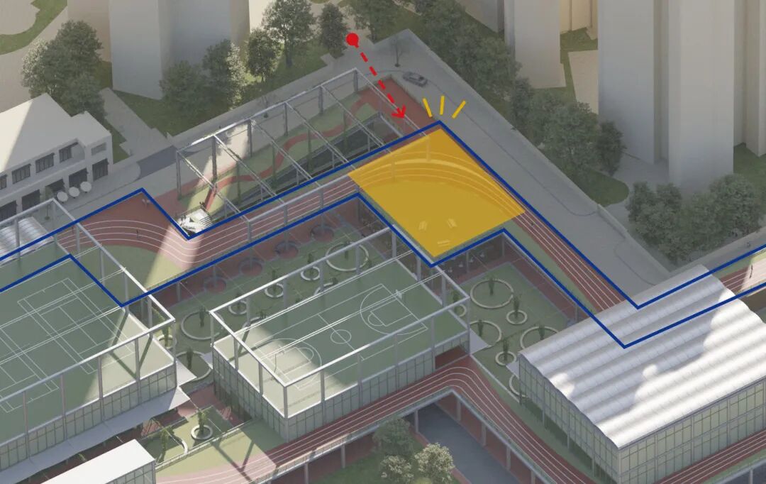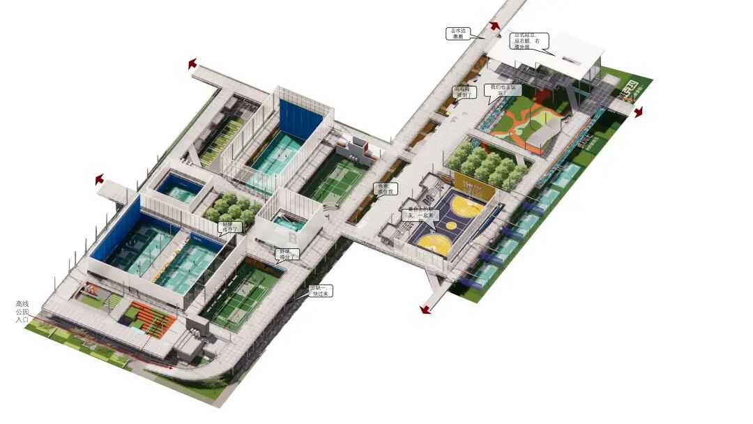 首层避开所有不可移动的设施和构筑物之后,植入各种球场与活动空间,大面积球场还是尽量置于地面。球场是相对稳定的空间,只需要规避所有流线,就可以正常使用。
