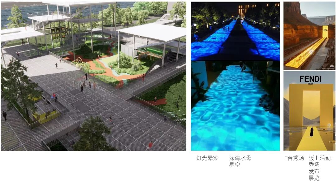 平台宽度12米,下面正好是一条路,长度跨越B地块。这个平台不仅联系下面的体育活动区和园区景观,自身也可以展开非常多活动,如T台秀、灯光秀等。