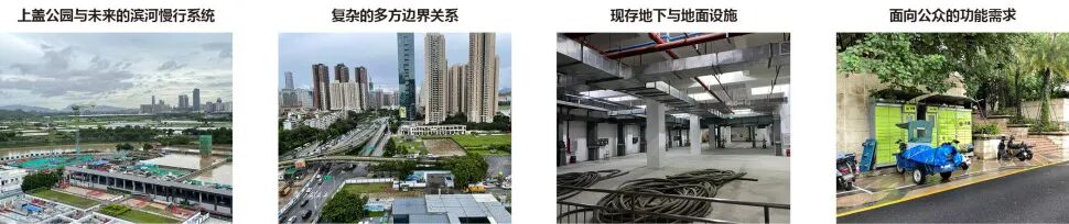 设计从场地的四个核心问题出发:上盖公园与滨河慢行系统的连接、复杂边界条件的应对、地下与地面设施的共生,以及社区和公众对功能的期许。