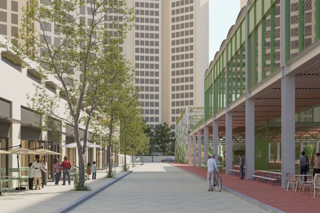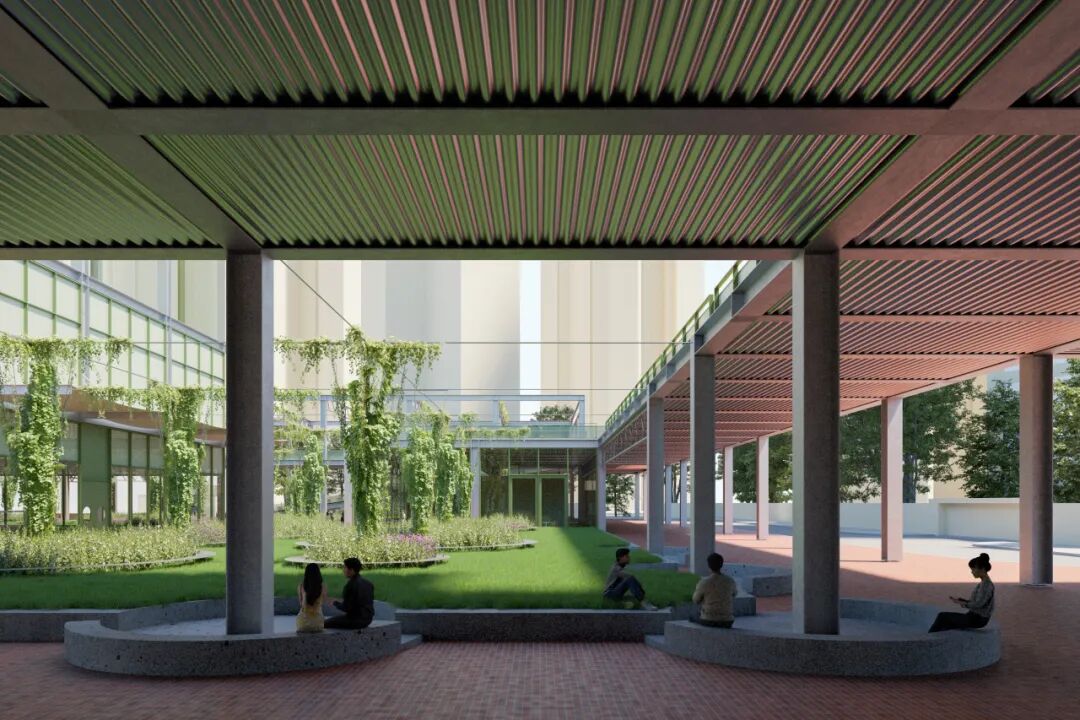 由于遵循现有地下柱网,架空廊道大多为8米宽,这一尺度使其不仅是交通空间,更具成为“室外房间”的潜力。我们在其中设置下沉式座椅与城市家具,使空间具备可停留、可利用的品质。