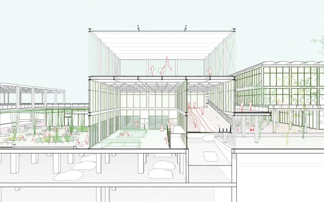 从剖透视图可见,通过结构的对应、设施的共生、景观的铺陈,新建的体育设施与既有地下基础设施共同紧密编织成一个完整、互联、面向未来的城市生活系统。