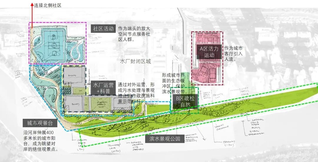 A区作为城市客厅引入人流,呈现活力氛围;B区在沿河景观带与城市界面之间形成生态缓冲区,疏松自然;C区将水厂出屋面的体量相对集中布置,使上盖公园形成沿景观延展的线性布局。