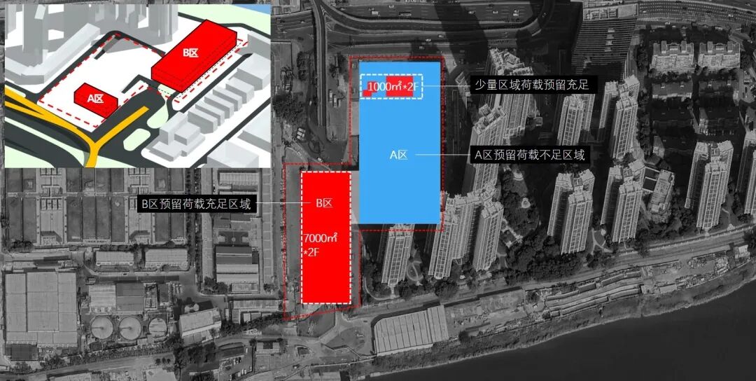 由于A区承载力不足,如果按照结构条件,大部分场馆建筑将放在面积小的B区,而面积大的A区则只能放置小体量的配套或者地面半室外球场。