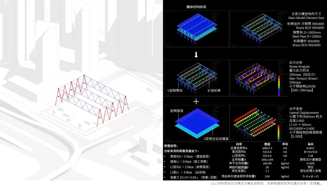 结构方面,A地块压力比较大,经过测算,覆土清除之后有2.3吨/平方荷载,采用一层钢结构+局部吊挂,活载与荷载均满足要求。所有柱子均落位于贯穿柱上,没有转换。