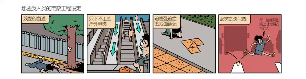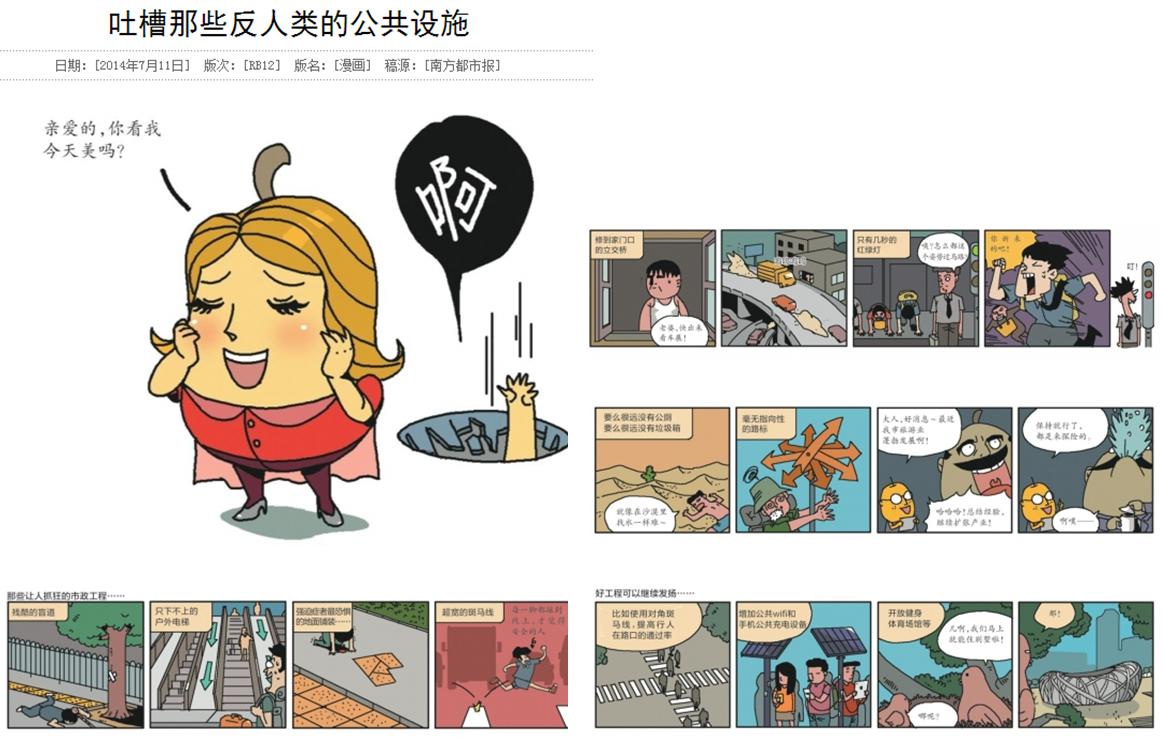 这个过程中,我们也关注到《南方都市报》出了这样一期非常有趣的漫画,吐槽那些反人类的公共设施,这种轻松诙谐的方式直击要害。