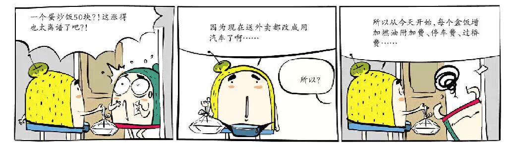 叫外卖发现一个蛋炒饭都要五十块钱,咋能这么离谱?,回答是因为现在送外卖都改用汽车,不能用电单车,所以从今天开始每个盒饭增加燃料附加费、停车费、过桥费···就像坐飞机一样贵了。