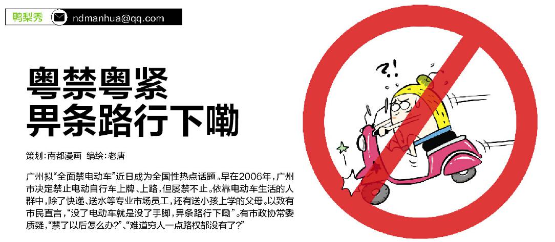 这幅漫画是今天见报在南方都市,也是我昨天在编版的,你们是第一读者。最近广州有一条很不人道的规定,想全面禁电摩托车。其实06年广州就决定要禁止电动自行车上牌上路,但是大家都不听继续用。因为依靠电动车生活的人太多了,除了快递、送水等专业市场员工,还有送小孩上学的父母。期间也有市委常委觉得这个政策不人道,质疑过“难道穷人连一点路权都没有吗?”我也觉得这个事情值得反思,所以用漫画反讽一下。
