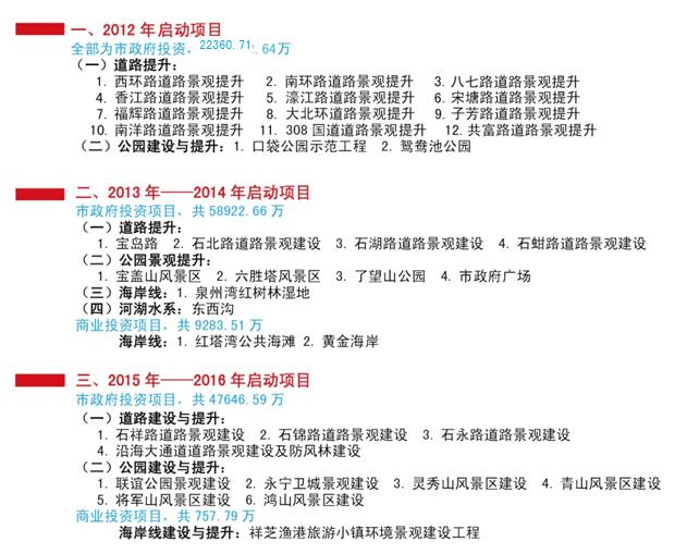 这是政府运作的一个项目,我们当时考虑项目库、前期概念、分项提升计划的思路。石狮算是比较富裕的城市,政府也想把城市景观做一个全面提升,分期来实施。我们做了整个项目库的规划表,分几年完成哪些项目,分哪些区域规划,投资多少,完成多少,总投资19亿。