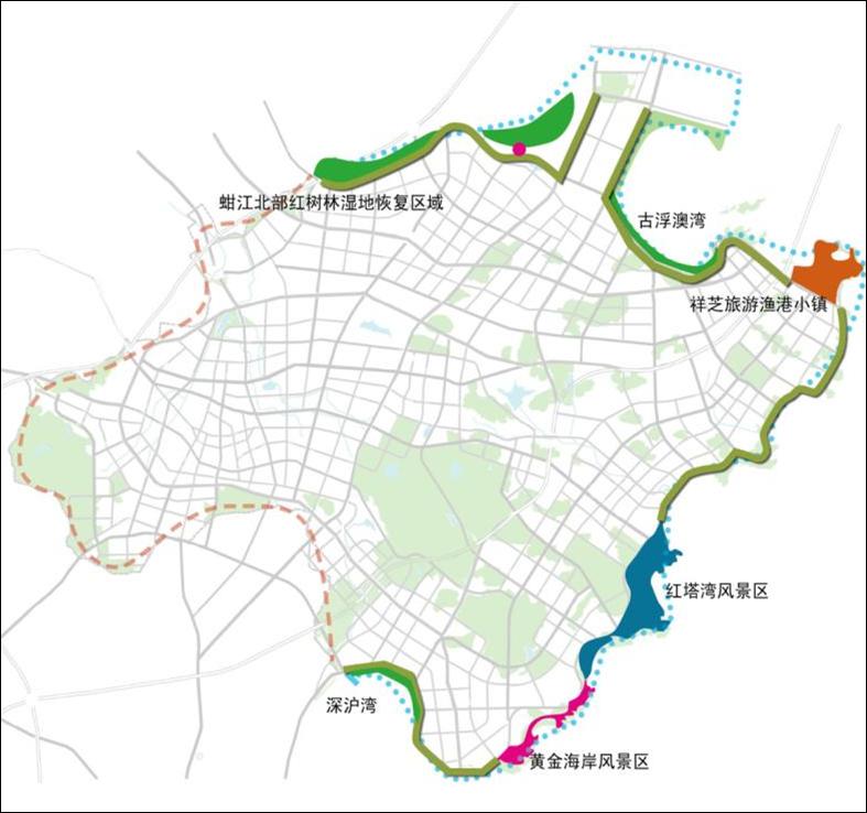 海滨公园绿地系统借用国外的概念,把各个方块的绿地通过绿化廊道串联起来,有一些重点打造。近期建议对风景区的现有的建筑和植物做一些梳理。