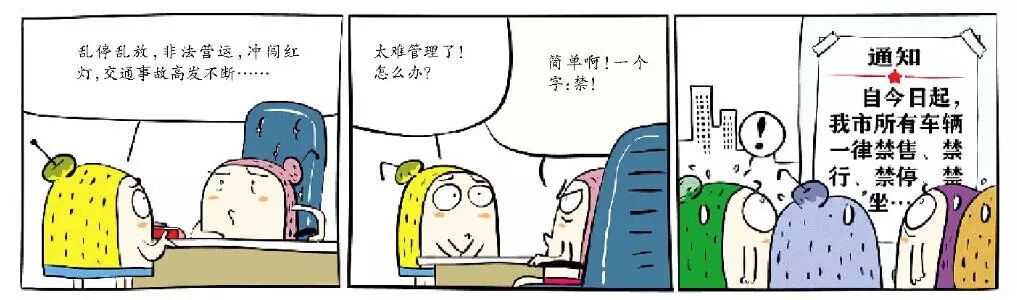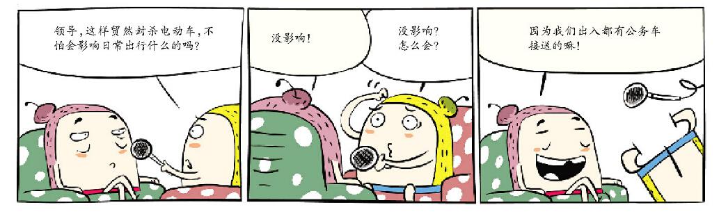 接下来这个漫画说,“领导,这样贸然封杀电动车不会影响日常出行吗?”“没影响。”“没影响?怎么会呀?”“因为我们出入都有公车接送的嘛。”