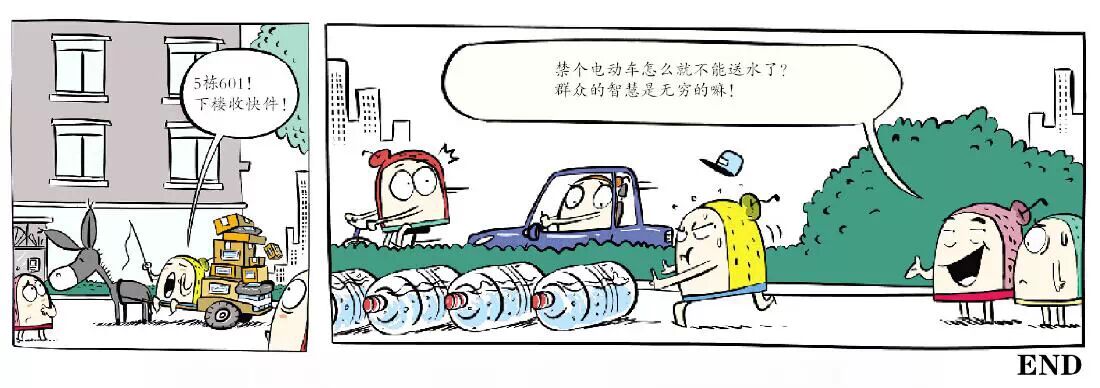 如果这个政策真的实行下来,扰乱了民生民计的话,小市民也有自己的智慧,电动车没有办法送水,我们就滚着来。当然这两个漫画是调侃。