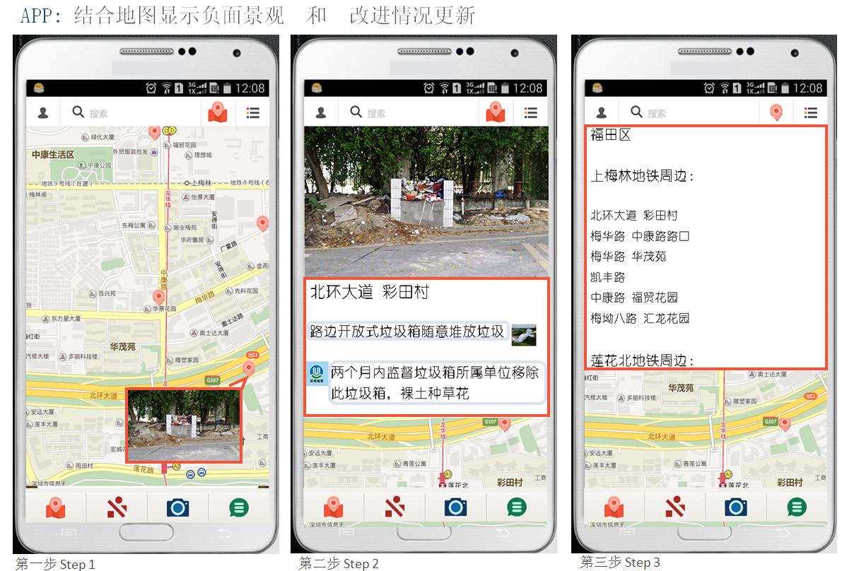 同时,我们也计划开发一个手机的APP程序,它结合地图来显示这个城市中有哪些负面景观,以及可以如何改进和更新。我们使用它时将负面景观拍一张照片,输入地点、问题,最后希望政府职能部门可以帮助我们来监督这些问题,并改进及反馈给大家。