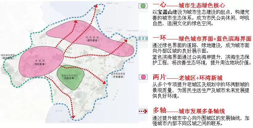整个规划结构为“一心、一环、两片、多轴”的概念,以老城作为中心点往四周辐射,连接滨海带,同时串联风景区,形成了这样一个肌理的架构。