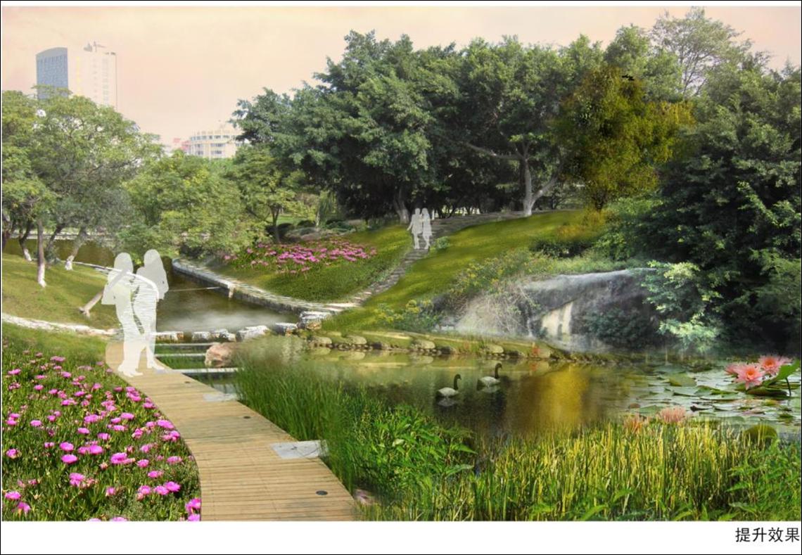 其中一个是福荣都市绿道。可能有人走过,它是带状公园,总长度3.08公里,面积10.27万平方米。福荣都市绿道,原来的功能是高速公路的隔音带,而且是封闭的绿化带,现在打开建设成带状公园,是亲民的都市绿道。有运动区、漫步休闲区、文化区、便民设施。 这是园岭公园,在上步路,也是把封闭的绿化带建成带状公园。