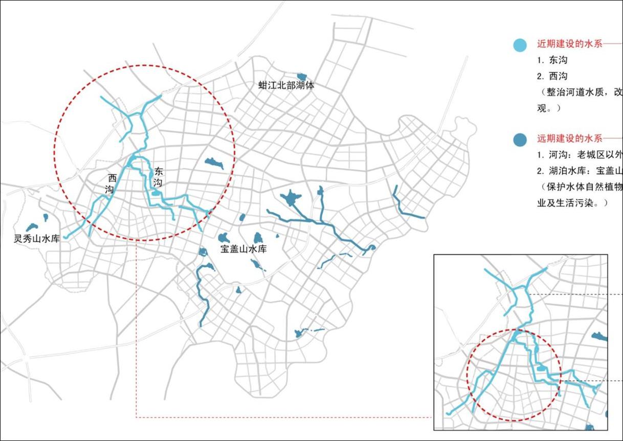 从整个城市的背景来讲,要引用城市文化和著名的风景点及城市现状——它的问题在哪里?景观绿化不足、街道宜人的尺度不够、公共开放空间较少、传统文化表现比较弱、城市水系统现状较差等。