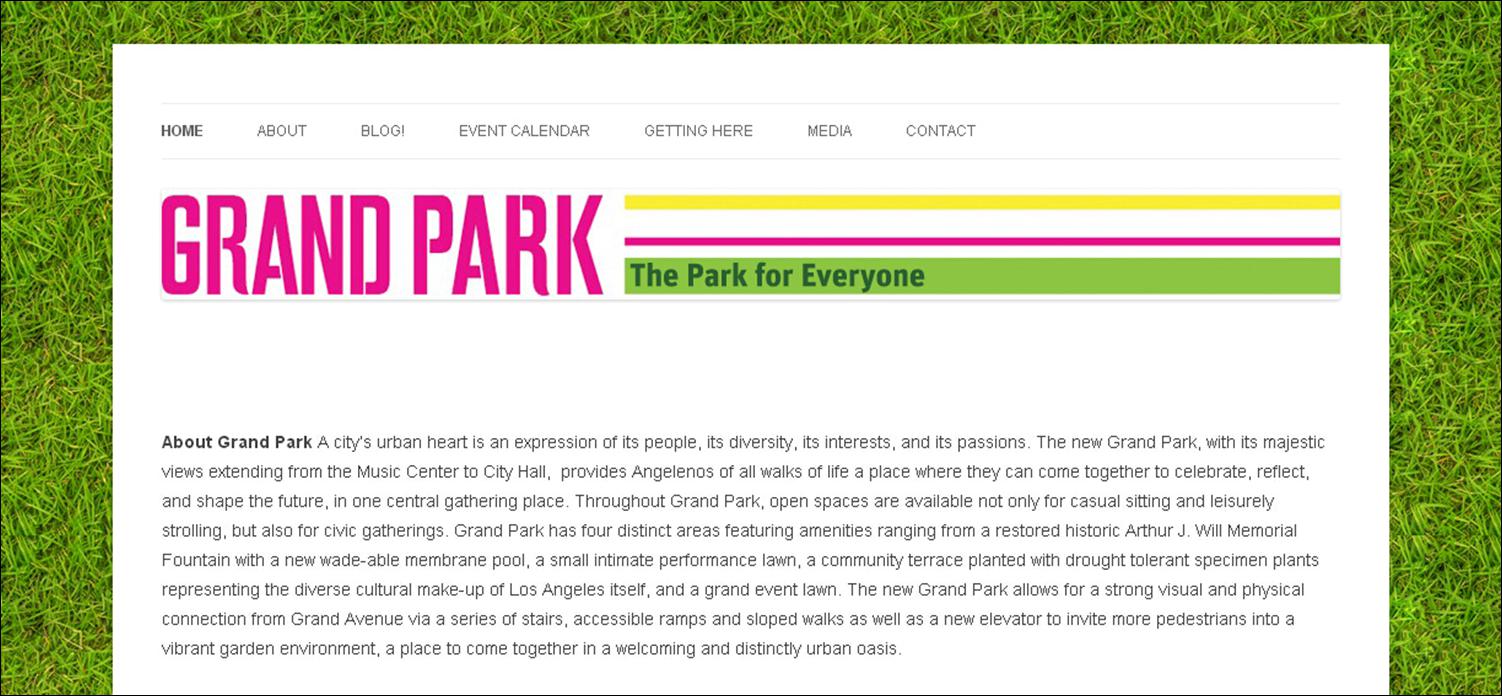 洛杉矶市中心大公园官方网站的首页,体现公园为各种群体服务的功能。