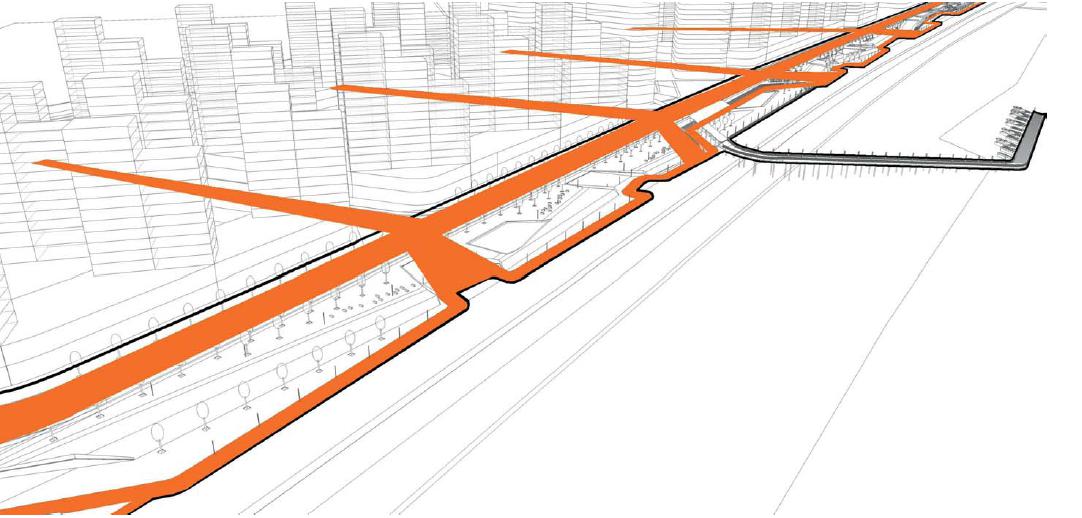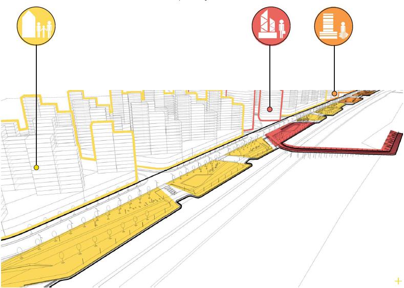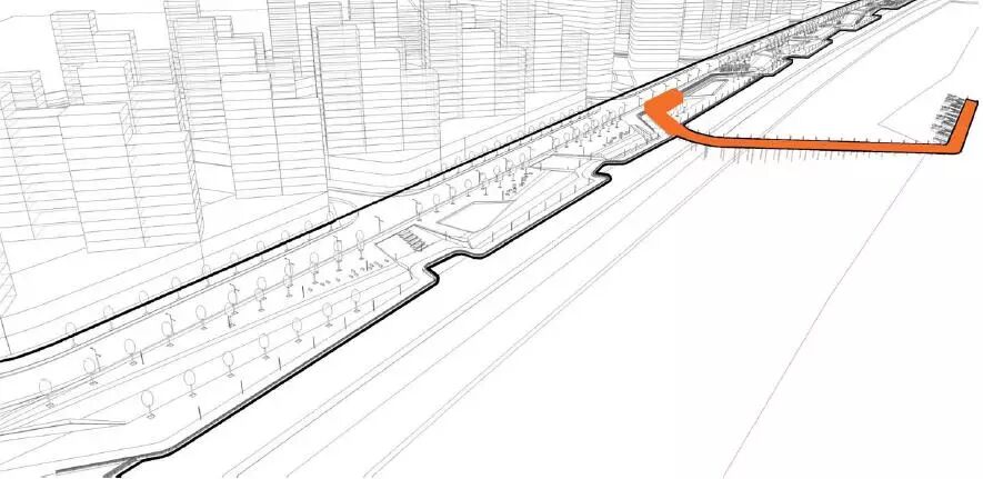 首先,滨水的街道景观需要有延续性来方便人流的活动。当人处在这个场地的时候必须明确的了解他要去的方向在哪边,而不会迷失在当中。