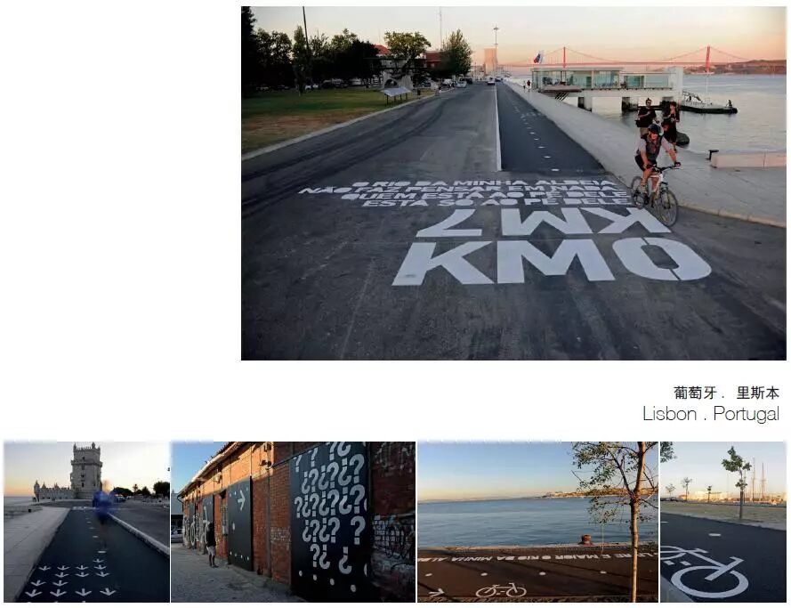 这是里斯本的另外一个项目,这个项目主要是想表达,即使是很简单的条件,也能让人们走到这里觉得好有趣,会心一笑,对这片场地产生兴趣。我们看到就只有一条车行道、一条自行车道和一条人行道,但是这边我们运用了一一些很有意思的元素,譬如在地上写了一些诗句。不但如此,还有一些比较特殊的小符号、有趣的设施图案,都会让人们对场地产生亲切感,让他想到这片场地上来。